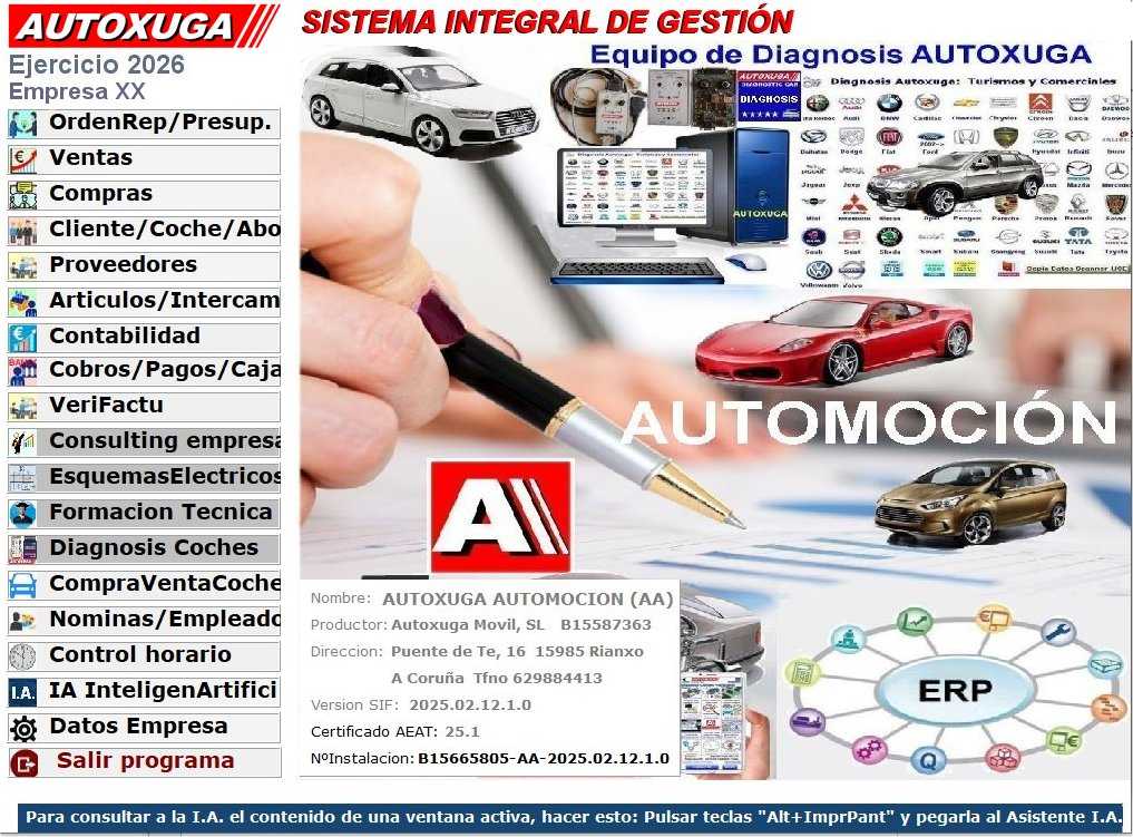 El programa de Gestión AUTOXUGA (Todo en Uno) es una herramienta diseñada para digitalizar la operativa completa de un taller mecánico. Centraliza desde la recepción de vehículos, facturación y contabilidad hasta el control detallado de recambios, presupuestos y finanzas. Además, envía los Modelos a la AEAT y facilita el cumplimiento legal mediante la gestión de la LOPD, optimizando la relación con el cliente a través de un historial técnico exhaustivo, permitiendo una administración eficiente y rápida. La diferencia con respecto a otros programas la puedes ver en estos 6 puntos (FAQ):